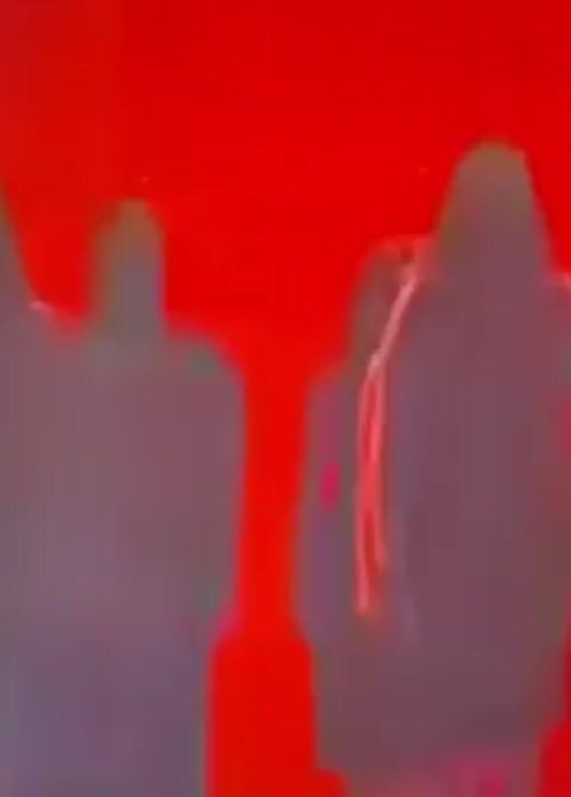 The video features a group of figures on a stage, illuminated by varying shades of red and orange lighting. At the center of the group is a man wearing what appears to be a head covering or cap. He stands out slightly due to the brighter light reflecting off this headwear. The surrounding figures are mostly women, their shapes defined by dark clothing and the warm-toned lights. Their actions are not clearly discernible. The overall setting suggests a performance or event, with the figures arranged in a manner indicative of a stage show.