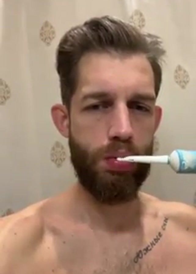 A shirtless man with dark hair and a beard is brushing his teeth with a blue electric toothbrush. He is looking into the camera. He has a tattoo on his chest that reads "ожылые сны". He is standing in a bathroom in front of a shower curtain.