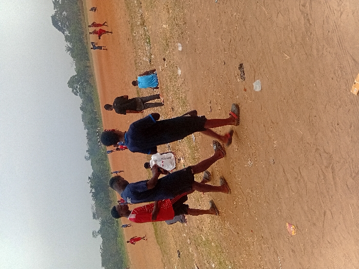 People are standing on a dirt field, possibly a sports field, with green trees in the background. Some people are further away, possibly playing or exercising. The focus is on a group of individuals in the foreground wearing casual clothing, shorts and shirts. The ground is brown and somewhat uneven with debris scattered around. The photo has been rotated from its original orientation.