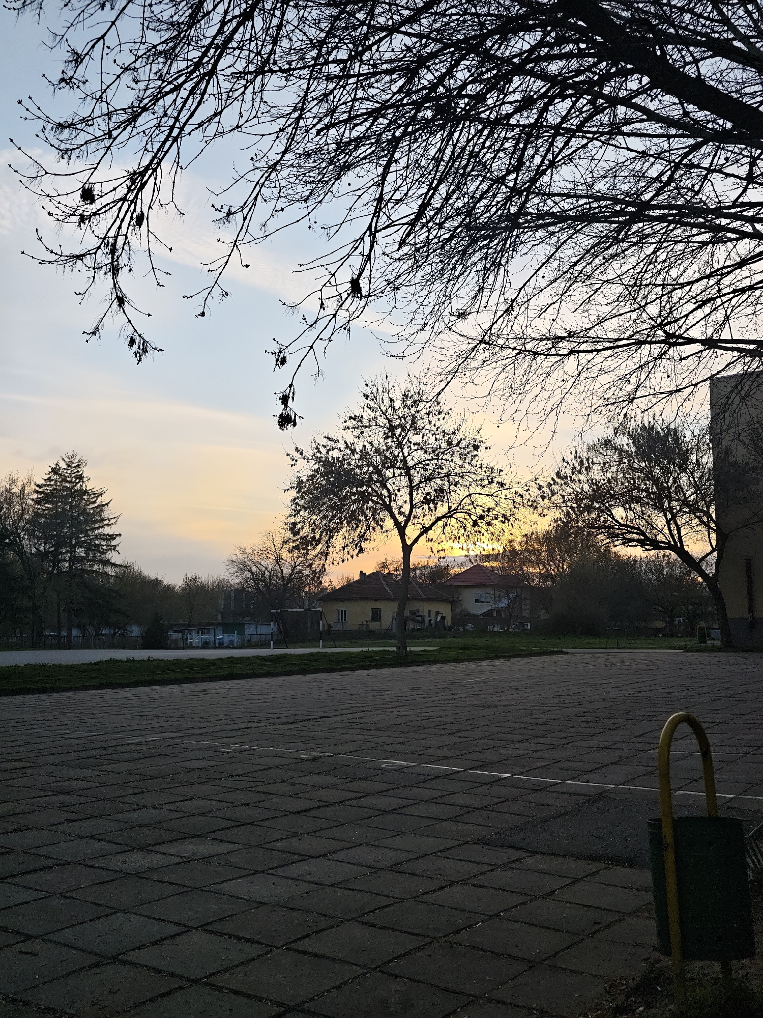 The image depicts an outdoor scene in Kozloduy, Bulgaria. The foreground is a paved square or parking area, constructed of grey interlocking blocks. A green trash receptacle with a yellow frame is positioned in the lower right corner. Beyond the paved area is a strip of green grass or vegetation. In the midground are several buildings, including a yellow house with a red roof. Bare trees, silhouetted against the sky, partially obscure the buildings. The sky is a mix of light blue and yellow hues, suggesting either sunrise or sunset. Overhanging the scene are the bare branches of a large tree, mostly obscuring the upper portion of the image. There are no people visible in the image.