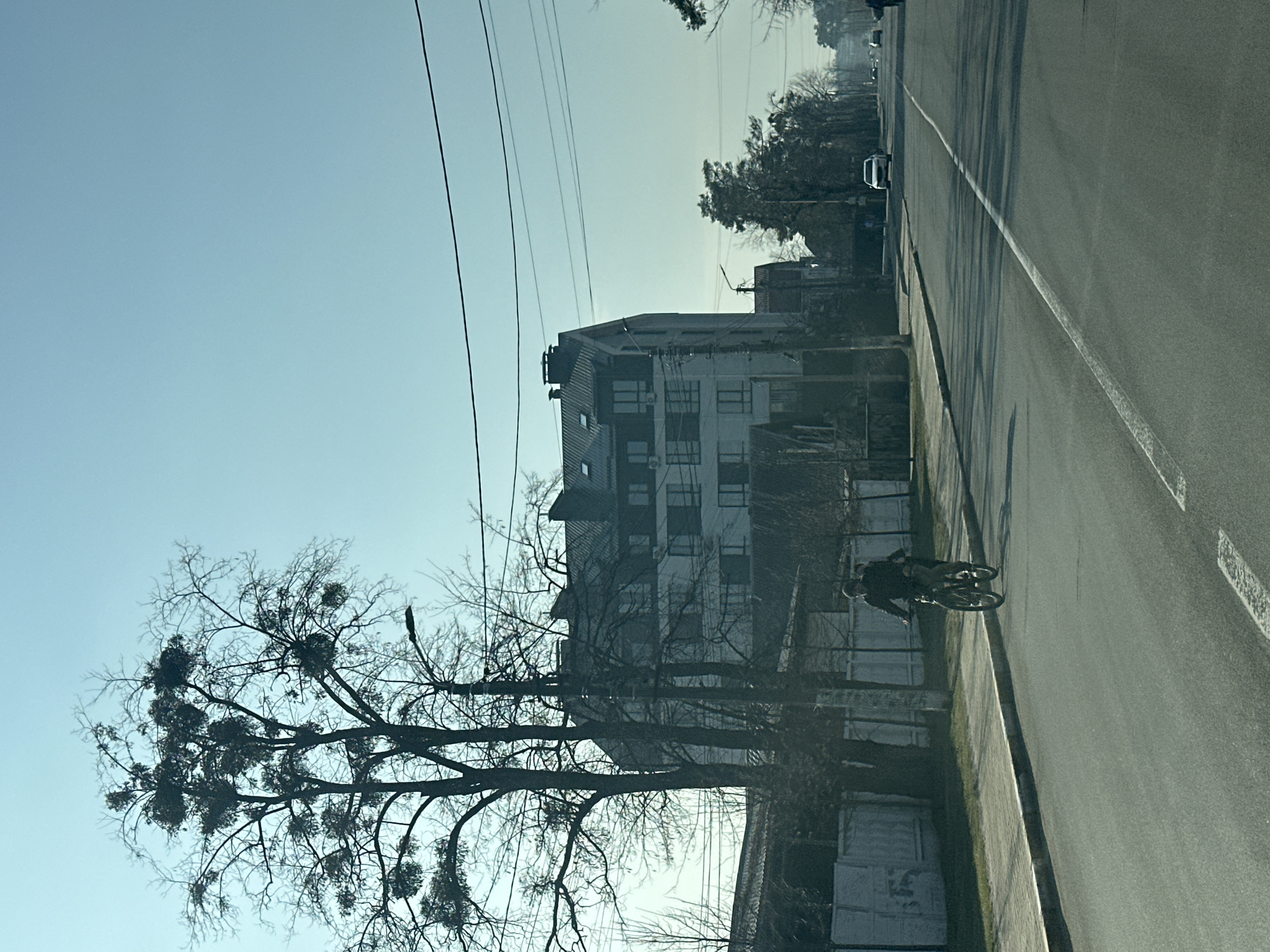 The image presents a daytime street scene in Irpin, Ukraine, under a clear, light blue sky. An asphalt road, marked with a solid white center line and a dashed white line further down, extends from the foreground into the distance. To the immediate left of the road, a paved sidewalk abuts a white corrugated metal fence. Behind this fence, several leafless deciduous trees are visible, heavily covered with parasitic mistletoe clusters. In the left midground, a person dressed in dark clothing is riding a bicycle away from the viewer, with a second individual appearing to be situated on the rear of the bicycle. In the background, a multi-story building with a light-colored facade, numerous windows, and a dark, sloped roof featuring multiple dormer windows or skylights stands prominently. Overhead, multiple black utility lines traverse the upper portion of the frame. Further along the road on the right side, a row of trees, including some evergreens, lines the street, with a white sedan and additional vehicles visible in the far distance, traveling in the same direction as the cyclist. A streetlamp pole is present on the right side of the road in the midground. The overall lighting suggests direct sunlight from the right, casting shadows towards the left.