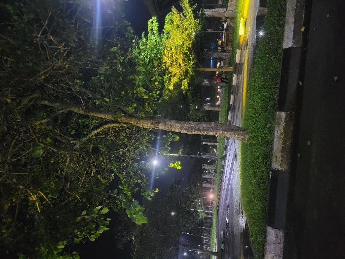 A nighttime scene captures a tree extending from the left over a grassy curb towards a paved road. Streetlights illuminate the foliage and road. In the background, lights outline buildings and a figure in red is visible. The road surface appears wet, reflecting the ambient light, and is bordered by a concrete curb with black and white markings.