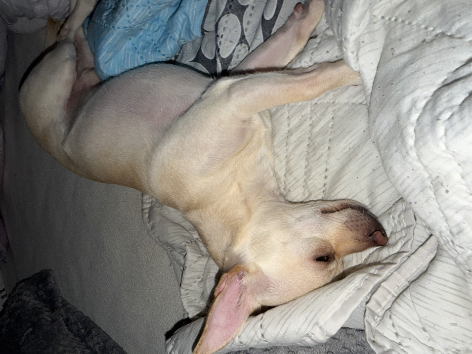- "In Kermen, Bulgaria, a small, light-colored dog, appearing tan or cream, is observed lying supine on a bed" by FM-7wZKu2, licensed under CC BY 4.0