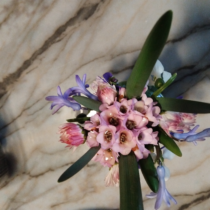 The scene presents an overhead view of a compact floral arrangement positioned on a light-colored, highly polished marble surface. The marble exhibits distinct dark gray to black veining and reflects ambient light, creating soft highlights and a slight distortion of the arrangement's base. The central components of the bouquet are numerous small, pale pink flowers, each approximately 1-2 cm in diameter, featuring prominent dark brown or deep reddish-brown centers. Interspersed among these are clusters of small, bell-shaped, purple-blue flowers, consistent with hyacinths or muscari, along with some smaller pink and white daisy-like blossoms. Several elongated, flat, dark green leaves are strategically placed within the arrangement, providing a contrasting backdrop to the lighter-colored blooms. A metallic or glass container, holding the flowers, is partially visible and reflective at the base of the arrangement. No human subjects or dynamic actions are depicted. The image portrays an indoor setting and lacks any specific visual identifiers or landmarks to confirm its geographical location in the city of Levski, Bulgaria.