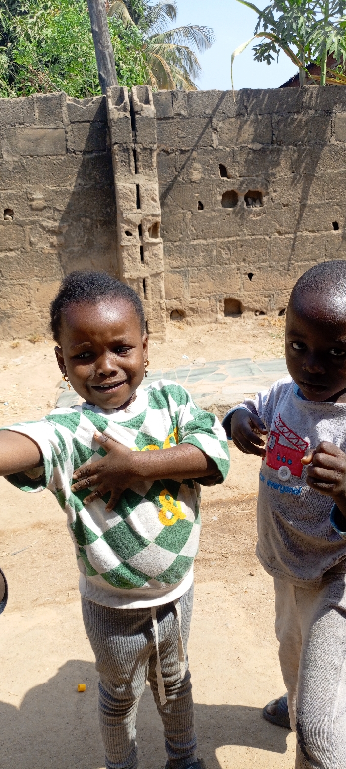 In Ungwan Liman, Nigeria, two young Black children stand outdoors in daylight before a weathered concrete block wall