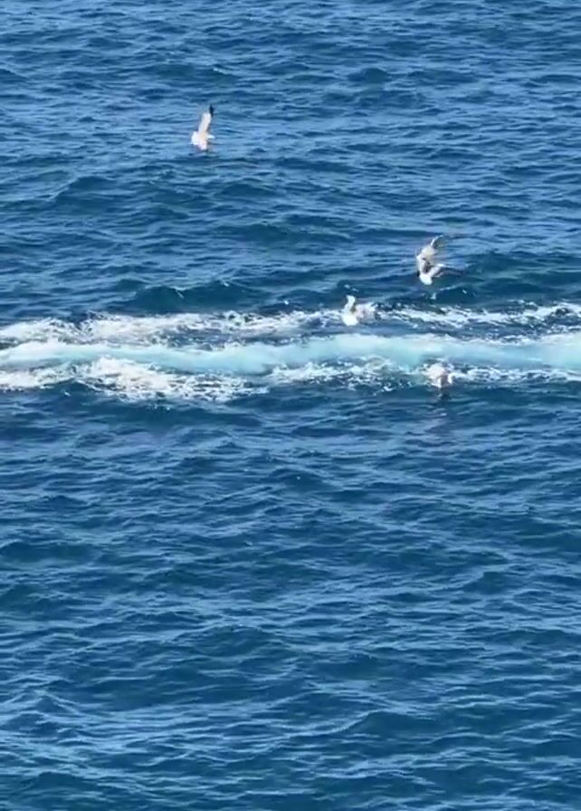 small motorized boat moving through the ocean, leaving a wake behind it. There appear to be two people on board, one in the front and one in the back, both dressed in blue shirts. Several seagulls are flying around the boat, with one briefly landing on the front. The water is a deep blue, and the sky is not visible. The camera seems to be positioned at a higher vantage point, possibly from a nearby cliff or higher boat.