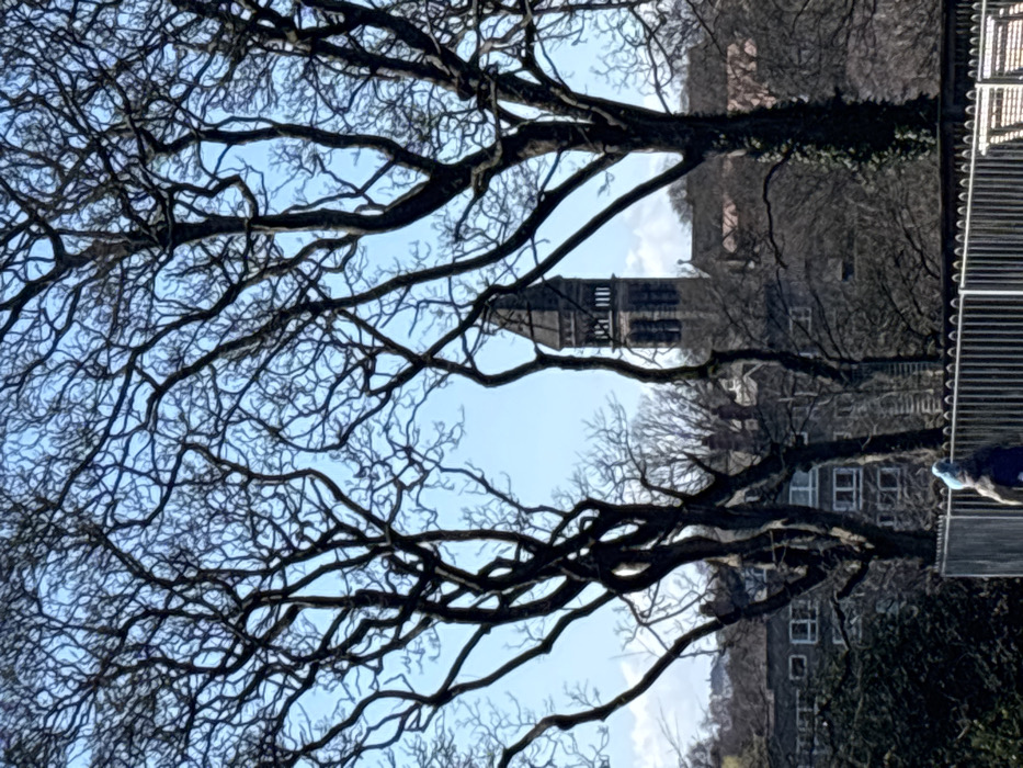 The image displays an outdoor urban landscape during daylight under a clear blue sky. The scene is located in Newcastle upon Tyne, United Kingdom, featuring St. George's Church in Jesmond. In the lower foreground, a white metal railing or fence runs horizontally. To the left of this railing, the back of an individual is visible, wearing a light blue knitted hat and a dark blue or black jacket. Dark green foliage is present to the immediate left of this individual. The midground and upper portions of the image are dominated by numerous tall, bare deciduous trees, their intricate, leafless branches creating a dense network that partially obscures the background. Through and above these branches, the prominent, dark stone tower of St. George's Church is visible in the mid-distance. The tower features a pointed, conical roof and distinct vertical fenestrations. Behind the trees and surrounding the church, various urban buildings, including multi-story structures with rectangular windows and assorted rooflines, are discernible, though partially obscured.