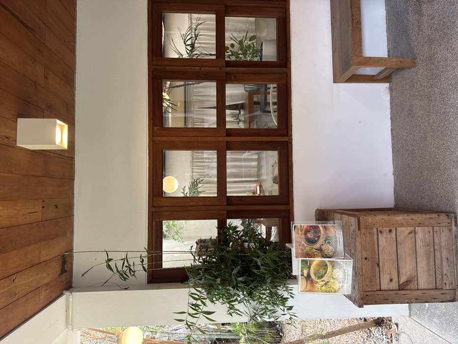 A wooden-framed window is composed of eight square panes. Plants are visible both inside and outside the window. A light fixture is mounted on a wooden wall to the left. A wooden crate is on the right, accompanied by two images displaying food. A wooden shelf is situated above the crate. The surrounding walls are painted white.