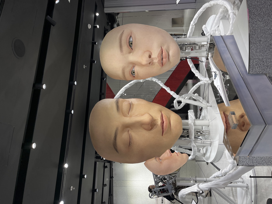 Three mannequin heads are displayed in an art installation. One has eyes open, one is closed, and the third is reflected in a mirror. The heads are connected to white, tentacle-like structures with metallic components. A person is visible in the background, seemingly adjusting the installation. The display sits on a grey and white tiled floor with a dark ceiling.
