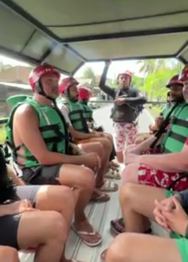 Inside a truck bed with a metal roof, six people are seated, wearing life vests and red helmets