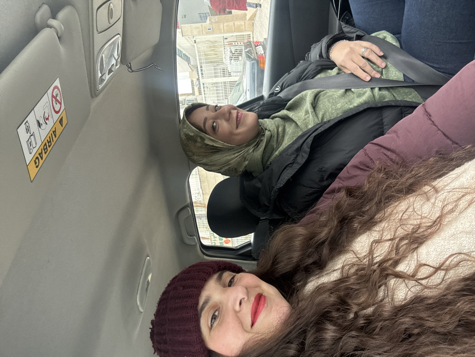Two women are seated inside a vehicle in Meknes, Morocco, captured in a selfie-style photograph