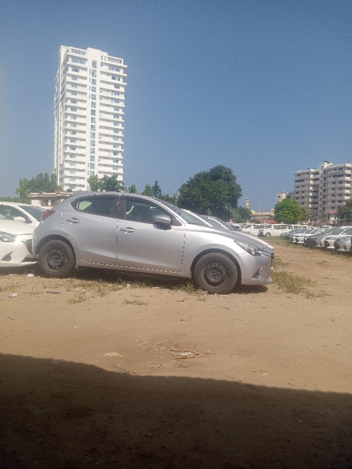 The image depicts an open-air commercial car parking and storage lot under a clear blue sky, located in Makadara/Mji Wa Kale ward, Kenya. The foreground consists of a shaded, unpaved dirt ground with sparse patches of dried weeds and scattered debris, including what appears to be segments of a chain and broken brick-like objects. In the midground, a silver 2015-2019 Mazda 2 (Demio) hatchback is prominently parked on the dirt, oriented to the right. It features black steel wheels without hubcaps. To its immediate left, the front section of a white compact car is partially visible. Extending into the right midground and background, multiple rows of identical white or silver compact sedans are parked in an organized manner, suggesting a car dealership or import lot. Further back, several white vans or minibuses are also visible. The background features an urban environment. To the left, a tall, slender, modern white skyscraper with numerous balconies dominates the skyline. To the right, a cluster of multi-story buildings, appearing older and less uniform, is visible, along with a mosque minaret. Green trees and bushes are interspersed between the buildings and the car lot. No people are visible in the scene. The lighting indicates bright daylight.