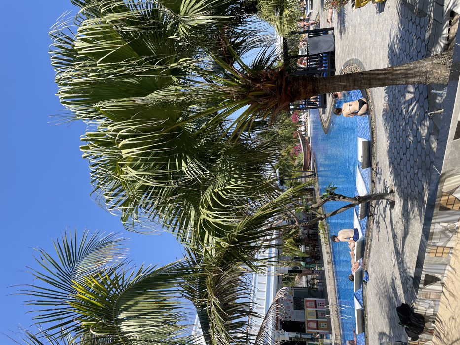 A poolside scene under a clear blue sky is framed by palm trees