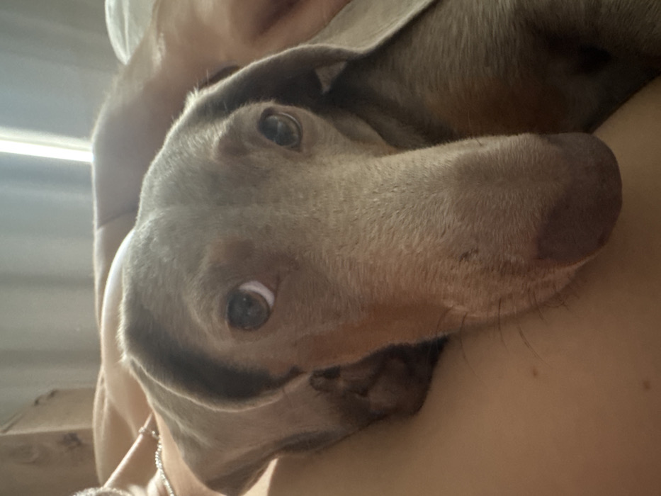 A close-up, indoor image depicts a fawn-colored short-haired Dachshund dog positioned closely with a person