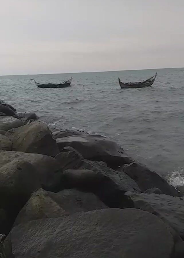 rocky beach with two small boats floating on the water. The sky is overcast, and the water appears calm with small waves. The boats are relatively close to the shore and appear to be unoccupied. The camera is static, providing a steady view of the scene.