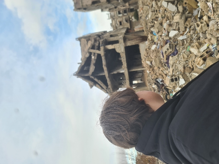 In Joubar Municipality, Syria, a person with short, wavy brown hair, wearing a dark hooded garment, is depicted from behind and slightly to the right, looking towards the right side of the frame. The immediate foreground and mid-ground consist of a large, uneven mound of construction debris, including shattered concrete, broken bricks, exposed rebar, and scattered refuse. Beyond this rubble, several multi-story concrete buildings stand severely damaged and partially collapsed, with significant structural integrity compromised and upper sections reduced to exposed frameworks. The sky above is partially overcast with visible patches of blue.