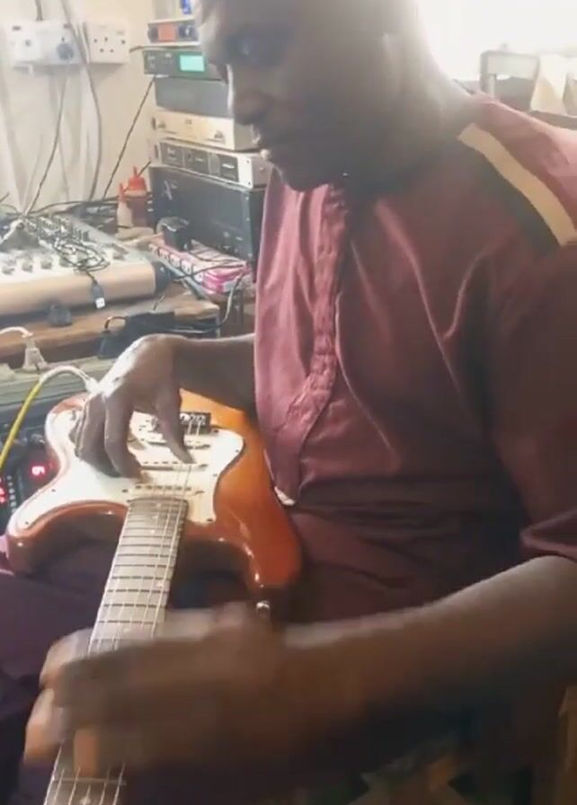 A bald, dark-skinned man sits on a wooden stool and plays an electric guitar. He is wearing a burgundy button-up shirt with a stripe on the right shoulder and burgundy pants. The guitar is light brown with a white pickguard. Behind him are stacks of audio equipment, including a mixing board and multiple rack-mounted units, along with cables and electrical outlets. He is focused on playing the guitar, his fingers moving along the fretboard. The lighting is bright and somewhat harsh.