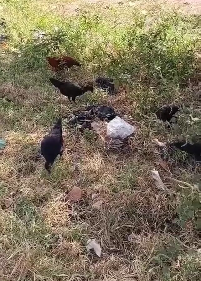 several chickens in an outdoor area. A mix of black and brown chickens are foraging in an area covered with dried grass, patches of green plants, and scattered trash, including pieces of plastic bags and a white plastic container. In the background, a single black chicken stands on a patch of bare dirt. The area seems to be a somewhat unkempt yard, likely in a rural or semi-urban setting. The scene is brightly lit by sunlight.