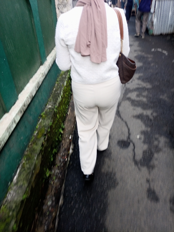 A person is depicted from behind, walking away from the camera on a dark, wet asphalt pathway in Bogor, Indonesia. The individual wears a textured off-white long-sleeved top, light beige trousers, and black shoes. A tan hijab covers their head and shoulders, and a dark brown shoulder bag with a visible chain strap is carried on their right side. To the left, a dark green wall or fence with a white base molding runs parallel to the path, bordering an open, moss-lined drainage channel containing some water. In the blurred background, several other individuals are also walking away, indicating a public thoroughfare.