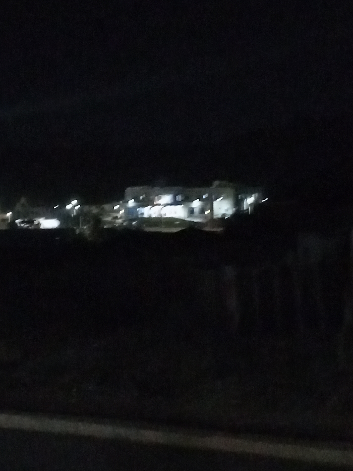 A blurry, nighttime image reveals a building in the distance, illuminated by lights. Streetlights dot the landscape around it. The foreground is mostly dark, with what appear to be trees or shrubs and a small road. The night sky is dark and featureless. The image has poor clarity.