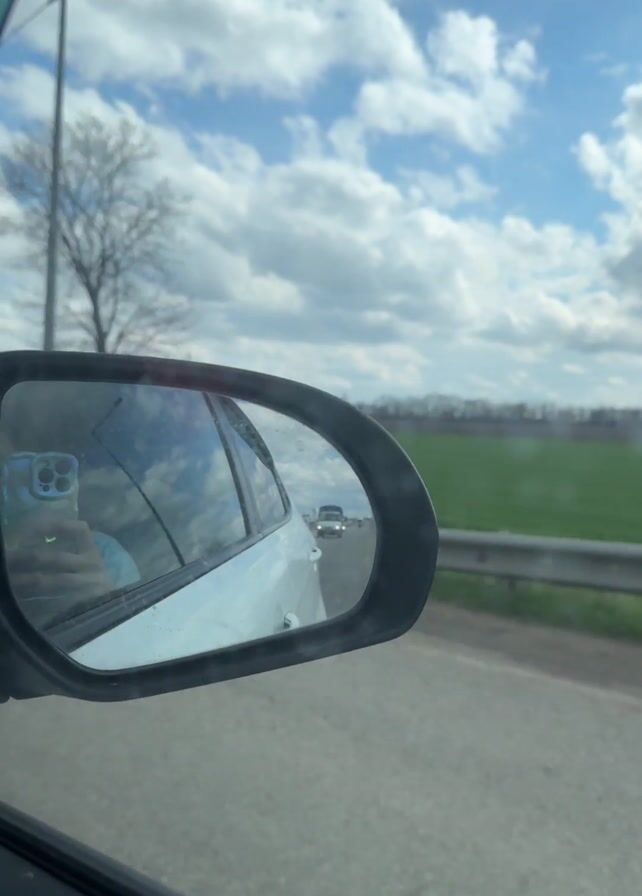 The video is shot from inside a moving car, focusing on the side mirror. The mirror reflects the side of the car, the photographer’s phone, and the car behind it on the road. Outside the car, a road stretches alongside a green field, under a cloudy blue sky. A tree without leaves stands in the distance. Road signs are also visible. There are puddles of water alongside the road.