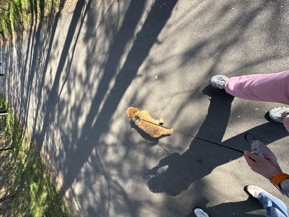 The image depicts an outdoor scene on a paved pathway within the city of Blagoevgrad, Bulgaria. A light brown, fluffy small dog, possibly a Poodle or similar breed, is walking forward on a black leash attached to a harness. The leash is held by an individual, whose perspective the photograph is taken from. This individual wears light pink pants and grey/white athletic shoes, with their hand holding a grey leash dispenser visible in the lower center. A second individual's lower legs and feet, wearing blue jeans and light-colored sneakers, are visible to the left. Long, distinct shadows of people and tree branches are cast across the asphalt path, indicating strong sunlight, likely from a low angle. The path is bordered by green grass and bare-branched trees. In the distance, two additional figures are visible walking further down the path, away from the camera.
