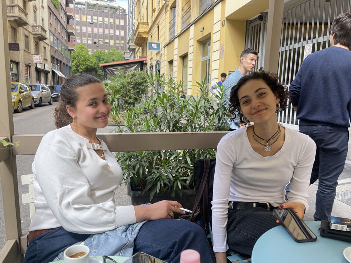 Two women are sitting at a table outdoors in a cafe in Milan, Italy, located at coordinates 45