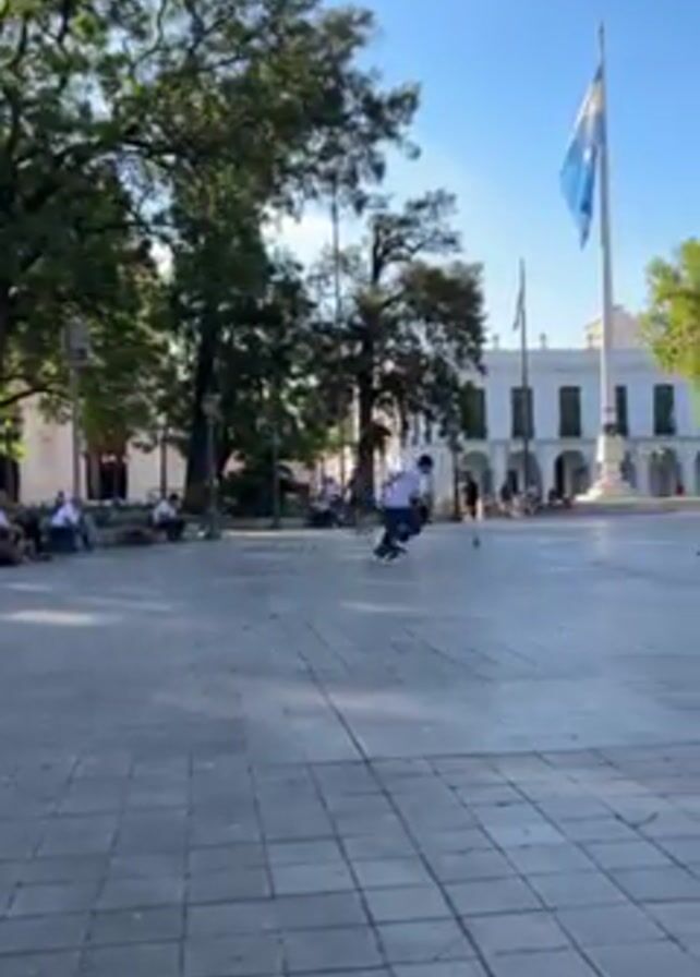 skateboarder performing tricks in a plaza on a sunny day. The plaza is paved with square tiles and features trees, benches, and a building with white columns in the background. People are sitting on the benches and walking around. An Argentinian flag is waving in the background. A flock of pigeons is present in the square. The skateboarder is wearing a white shirt, blue pants, and a cap. The camera follows the skateboarder as they move across the plaza.