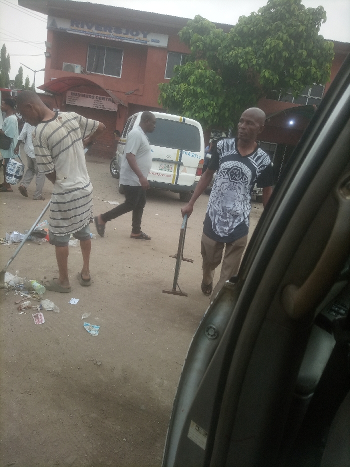 Three men are cleaning a street littered with trash. One man uses a broom, another uses a T-shaped metal tool, and the third walks nearby. A white van with blue and yellow stripes and "River Joy" signage is parked on the side of the street. Buildings with "Business Centre" and "River Joy" signs are visible in the background. The scene is viewed from inside a car, with the car's interior visible on the right side of the frame.