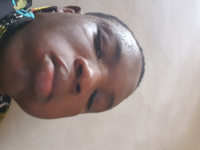 The image displays a close-up, front-facing portrait of an individual, likely a young person, with dark skin and short, dark hair