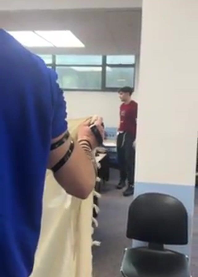 A man wearing a blue sweatshirt and jeans is standing, facing a white curtain, and wrapping his left arm with black straps. Another man, wearing a maroon t-shirt and black track pants, is standing nearby in what looks like a classroom or study room. There are desks, chairs, and a window in the background. The man in the maroon shirt touches his mouth with his hand before walking away.