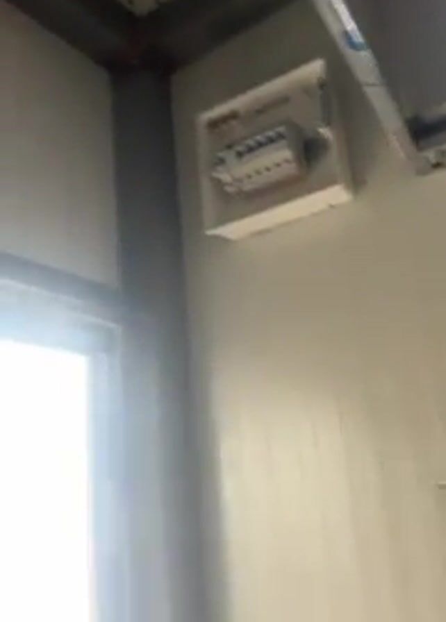 The camera pans around the interior of what appears to be a prefabricated structure. The walls are white and have a corrugated texture. An electrical panel is mounted high on one wall, and there are wires running along the ceiling. The window is visible, and one person wearing black pants is seen reaching up towards the ceiling near the electrical wiring.