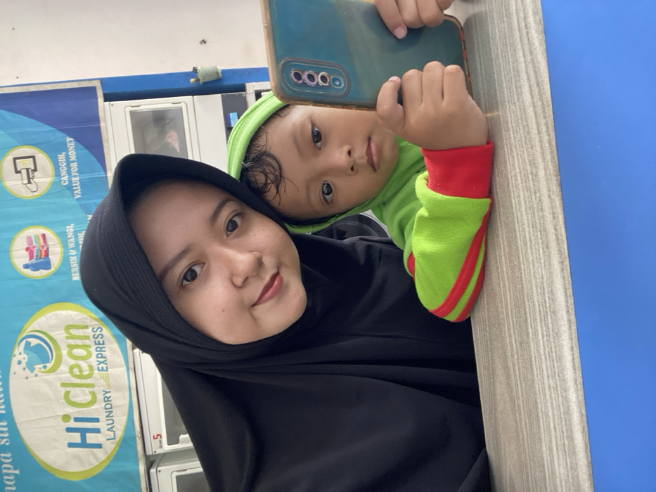 A woman wearing a black hijab poses for a selfie with a young child wearing a green hooded top with red accents on the sleeves. The child is holding a blue smartphone with multiple rear cameras. A Hi Clean Laundry Express sign is visible in the background, along with a row of washing machines. The sign advertises "Canggih, Value For Money" and "Bersih & Wangi."