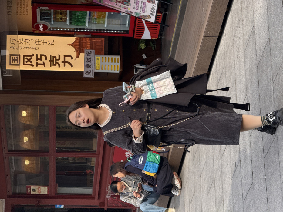 A woman in a dark dress with ruffled collar and trim stands on a paved street next to a store. She carries a black coat and bag. Behind her, two people sit or squat near a building with window displays. To the left, a red refrigerator stands next to a sign advertising "Chocolate Gift Box" in Chinese characters with the English phrase underneath. The sign also indicates "Free Tasting." The street is lined with the storefront and passersby.