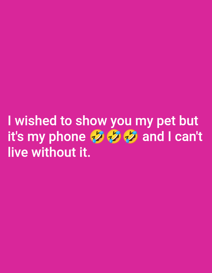 The image displays white text on a solid magenta background. The text is arranged across three lines and reads: "I wished to show you my pet but it's my phone 😂😂😂 and I can't live without it." Three "face with tears of joy" emojis are embedded within the second line of text. The font is sans-serif. No individuals, physical objects, or environmental elements of Akokwa, Nigeria, are visually depicted; the scene consists solely of text and emojis on a colored field, representing a digital communication.