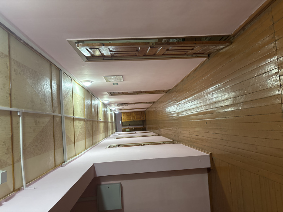 This image depicts a long, unoccupied indoor hallway within a building in the city of Bayronovka, Russia