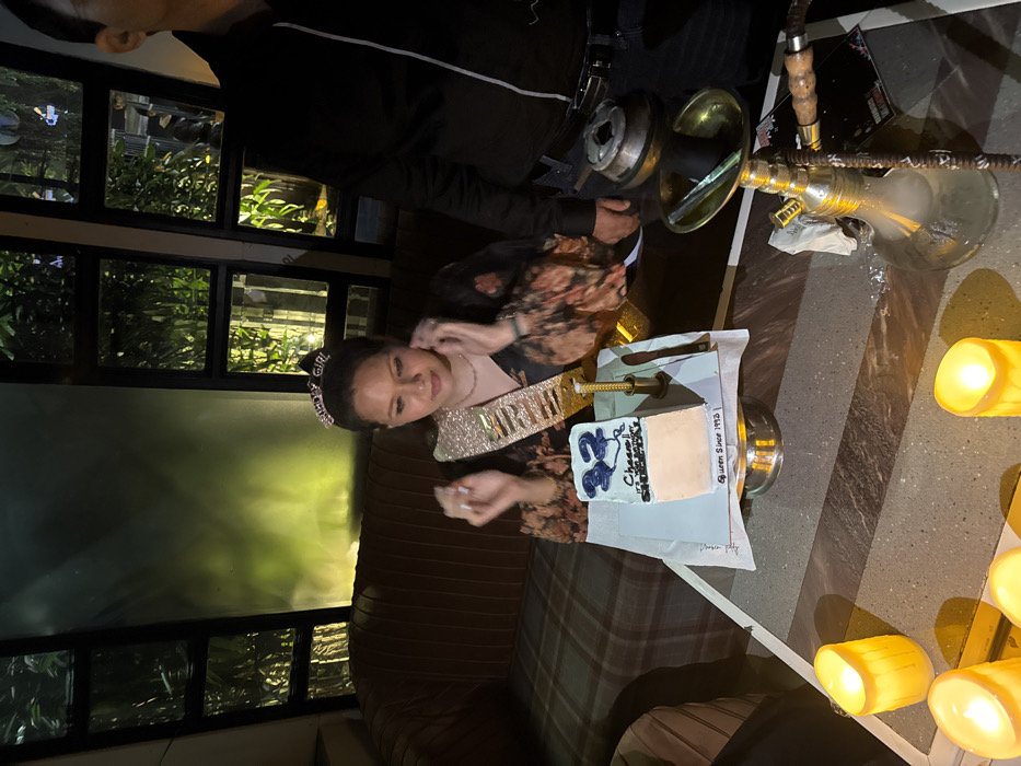 A young woman wearing a "Birthday Girl" tiara and sash poses at a table for her 22nd birthday. Her cake, resembling a calendar, reads "Cheers to 22!" Candles and a hookah are also present. She appears to be seated in a lounge or restaurant, near large windows with dark frames. A person in black stands nearby, partly obscured by the hookah.