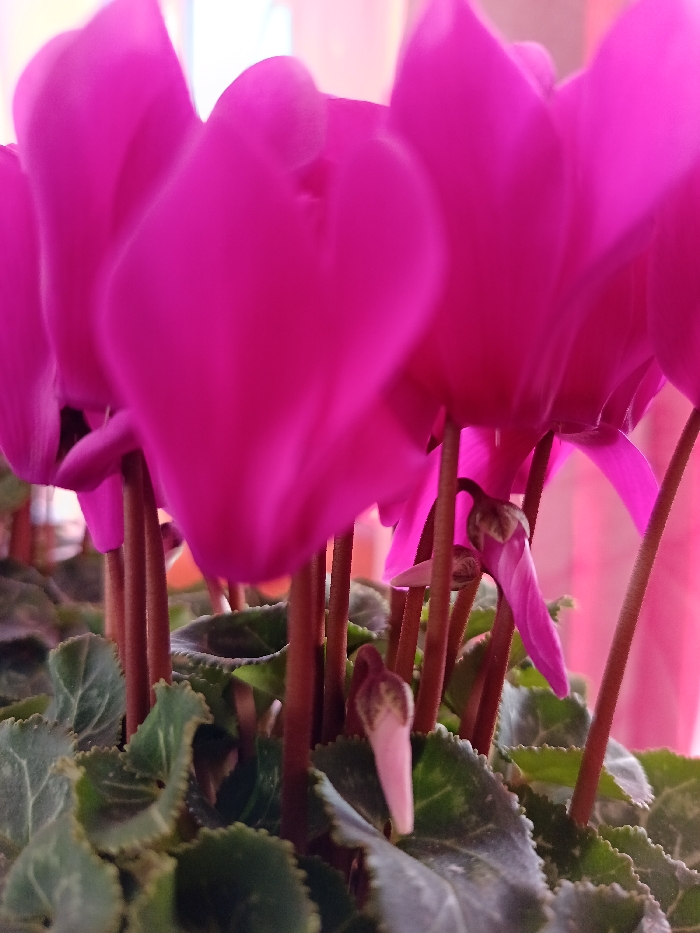 The image displays a close-up, low-angle view of a flowering Cyclamen plant, situated indoors. Multiple fuchsia-colored flowers with upward-reflexed petals are prominent, occupying the upper portion of the frame in soft focus. Numerous reddish-brown stems support these flowers, emerging from a dense cluster of dark green leaves located at the base of the plant. The leaves exhibit lighter green or silvery patterns and serrated edges. Several pale pink flower buds, ranging from tightly closed to partially unfurled, are visible among the foliage. The background is a blurred field of diffused light and soft pink hues, indicative of an interior setting, likely near a window. No individuals or external landmarks are present. The scene's specific location within Kamenz - Kamjenc, Germany, cannot be determined from the visual evidence, beyond being an indoor environment.