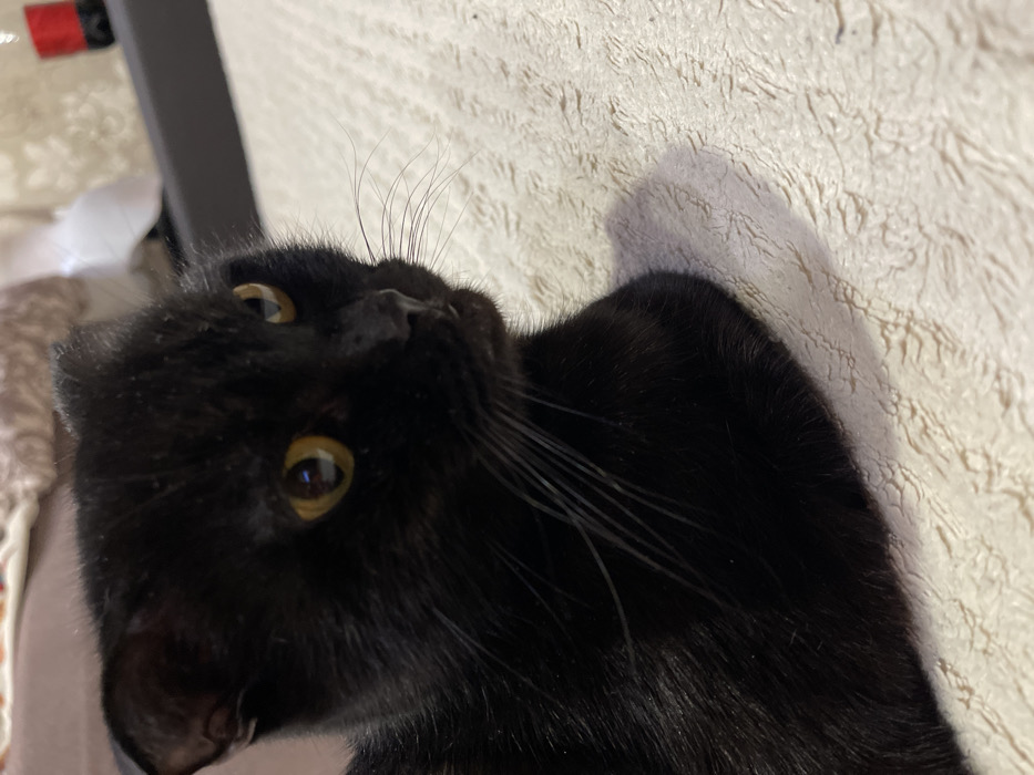 The image depicts a black cat in an indoor setting. The cat is positioned on a light-colored, textured surface, possibly a cream or beige blanket or carpet. Its body faces slightly to the right, with its head turned to the right side of the frame, and its amber-yellow eyes are focused towards that direction. The cat exhibits characteristics consistent with a Scottish Fold breed due to its folded ears. White whiskers extend from its muzzle. A soft shadow is cast by the cat onto the surface to its right. The background is blurred, showing indistinct domestic elements such as blurred fabric and a dark, possibly red, object. The specific city of Trudovoi, Russia, cannot be confirmed from the visual information present in the image. No people are visible.