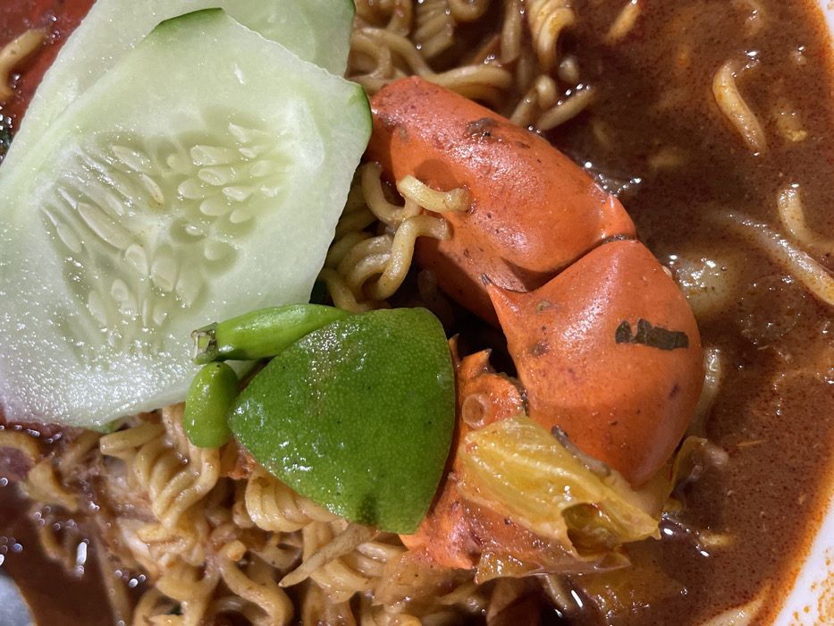 A close-up, high-angle shot depicts a bowl of prepared food, likely Mie Aceh, situated in Alue Mudem, Indonesia. The central subject is a portion of reddish-brown broth containing numerous curly noodles. Prominently placed in the foreground is a bright orange crab claw or shell segment. Garnishing the dish are two thin, translucent slices of cucumber positioned at the top right, a wedge of bright green lime directly above the crab, and two small, green chili peppers adjacent to the lime. The broth exhibits a somewhat oily texture and contains fine particulate matter. A white bowl rim is visible in the bottom left corner, indicating the container. No people or specific environmental details beyond the dish itself are discernible.