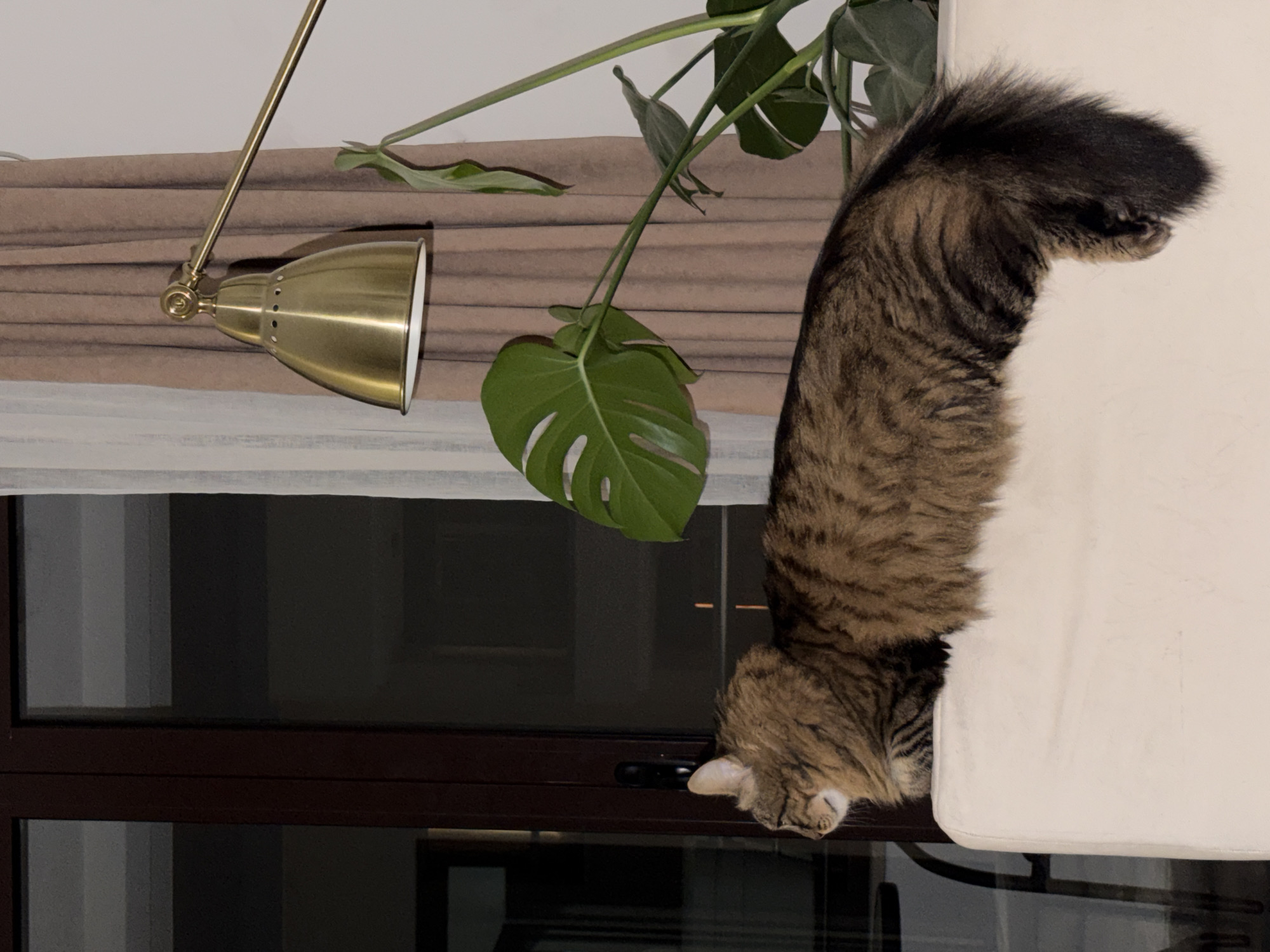 n interior scene. A tabby cat is positioned on a white sofa, with its head dangling over the edge. To the left of the sofa are a desk lamp and a monstera plant. In the background, a window is visible. The location is not discernible from the image.