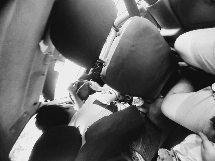 interior of a vehicle. A person in a t-shirt is behind the wheel, with a cigarette in their mouth. The vehicle appears overcrowded with multiple people. The seats are dark and plush. Discarded tissues and crumpled paper litter the floor. The view is from a skewed, high angle, giving a sense of claustrophobia. The image is in black and white.