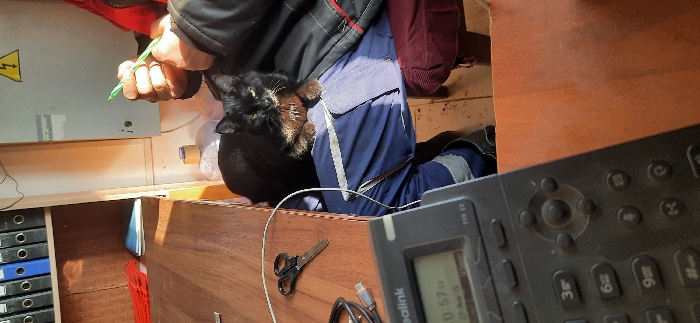 A cluttered workspace features a black cat perched on a person's lap. The individual wears blue work pants with reflective stripes and a dark jacket. A black Yealink phone sits prominently in the foreground, its screen displaying "10:57 pm." Scissors, a USB cable, and various items are scattered on the wooden surface. A cabinet with ring binders is visible on the left, and an electrical hazard symbol is nearby.