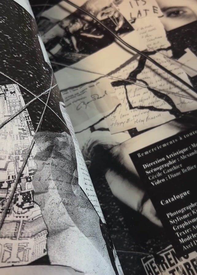 A hand opens a magazine displaying various images in black and white and color. The magazine pages include a collage of photos and text, a picture of a man's hands resting on a chair, and a brown shoe. The magazine has a glossy finish.