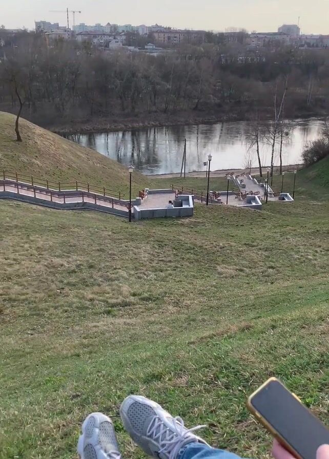 person's legs and feet as they sit on a grassy hill, looking down towards a river and a path with stairs and railings. Initially, the person is holding a cell phone, but it is later out of view. The person is wearing jeans and two different types of shoes, grey sneakers at first and then transitioning to a darker colored hiking-style shoe. The camera angle is from a first-person perspective, looking down. In the background, there is a river with reflections on the water, trees, and a townscape with buildings visible in the distance under a cloudy sky. The path has lamp posts along it, and the stairs lead to a building at the top of the hill.