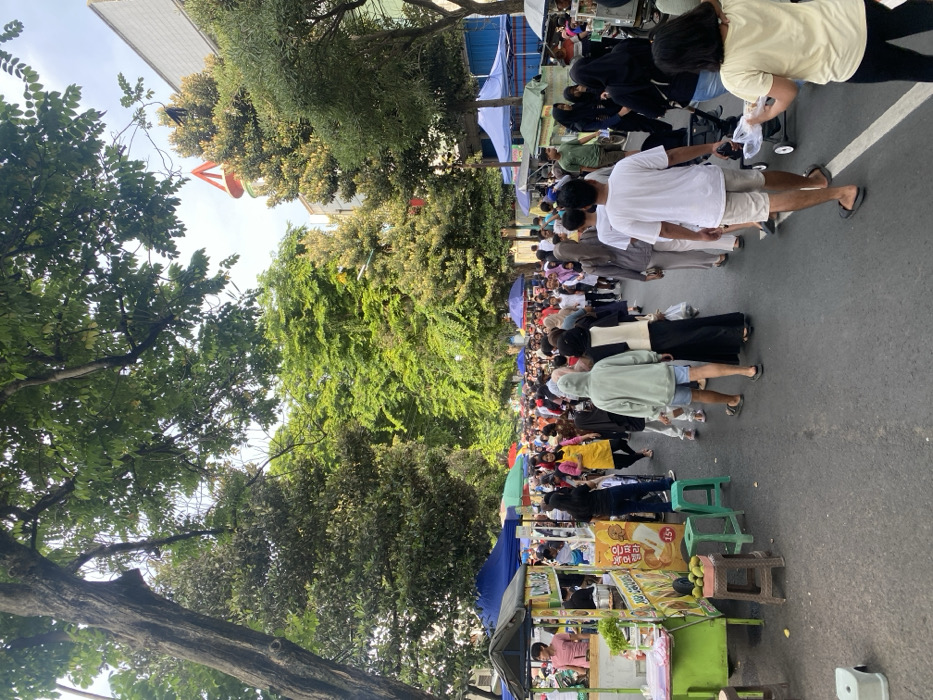 A large crowd of people stretches down a street lined with trees and vendors. The people are walking in both directions, some wearing light-colored clothing and others darker attire. Market stalls with blue canopies are visible along the edge of the street, selling food and drinks. Plastic stools are lined up in front of the stalls. The day appears sunny.