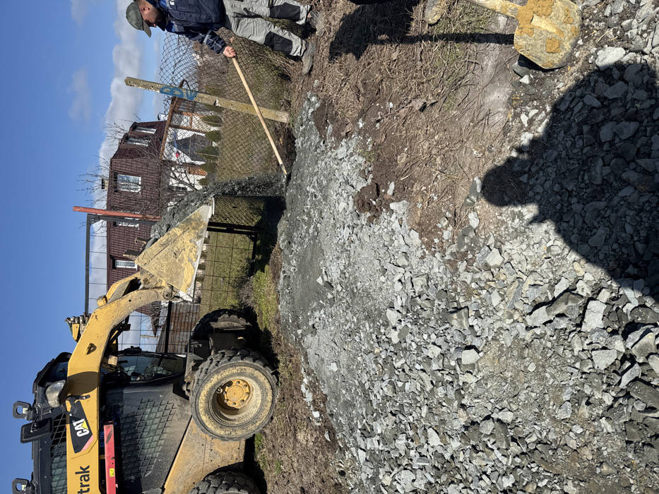 The scene captures a daytime construction or landscaping activity in Konstantinovo, Bulgaria. A yellow CAT skid-steer loader, marked "trak," occupies the left-center, its front bucket elevated and actively discharging a stream of grey, granular material onto the ground. To the right of the falling material, a male individual, dressed in a dark blue jacket, grey work trousers, and a dark cap, is depicted using a long-handled tool to spread or manage the material. A significant accumulation of grey, angular crushed stone or gravel covers the foreground. The ground immediately beneath the operation is a mix of dark soil and sparse, dry vegetation. A wire mesh fence with a prominent concrete post, marked with blue paint, extends across the middle ground, separating the work zone from the background. The background features residential buildings, notably a brown house with a multi-gabled dark roof and white-framed windows, along with several bare-branched trees. The sky is clear and blue. A distinct human shadow, likely that of the photographer, is cast across the lower foreground, partially obscuring a yellow-orange shovel on the ground to the right.