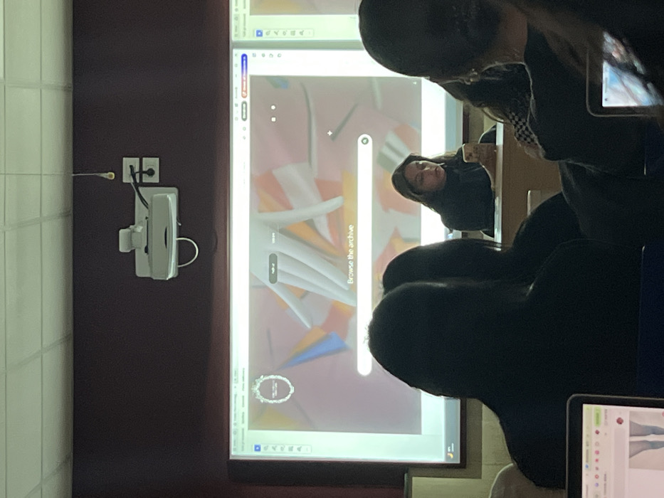 The image displays an indoor scene, likely a classroom or lecture hall, with dark red walls and a white grid ceiling. A large projection screen occupies the central and upper portion of the frame, displaying a web page featuring a search bar labeled "Browse the archive," a stylized logo (partially legible as "Maison Valentino"), and a background image incorporating abstract, colorful shapes and a stylized hand. A projector is mounted on the wall above the screen, connected to power outlets. Several individuals are seated, facing the screen. The foreground primarily shows the backs of multiple heads, silhouetted against the bright screen. Two open laptops are visible on desks in the foreground; one displays an image of clothing, and another shows a map or diagram. In the mid-ground, a female individual with dark hair and a dark top is seated, holding a smartphone in both hands and looking down at its screen. The specific location within the city of Rome, Italy, cannot be determined from the visual information provided in the image.