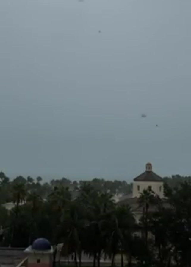 The video presents an overcast outdoor scene of a cityscape, with buildings, trees, and foliage. Dominating the view is a structure with a dome-shaped roof located towards the right of the frame. To the left is another building with a distinct dome, suggesting an architectural theme within the setting. The sky is uniformly gray, indicative of heavy cloud cover and potentially rainy conditions. The foliage and trees appear dark and dense, adding to the somber atmosphere. Palm trees are interspersed among the greenery, suggesting a tropical or subtropical location. There are no visible people in the shot. The camera angle appears to be from an elevated position, possibly a high-rise building, overlooking the urban landscape. The scene suggests a moment of stillness or a calm before or after a storm, characterized by muted colors and a lack of vibrant activity.
