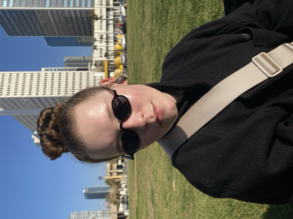 A young individual, appearing female, is depicted from the torso up, centered in the frame. Their brown hair is styled in a high bun. They wear small, oval-shaped black sunglasses and a silver-colored tunnel in their stretched right earlobe. A black coat covers their upper body, and a wide, light beige fabric strap, featuring a rectangular silver-colored buckle, crosses diagonally over their right shoulder and chest. The individual faces the camera directly, exhibiting a neutral expression with slightly glossy lips. The foreground consists of a sparse green lawn, suggesting an urban park or open grassy area. Behind the individual, a street or pathway is visible, lined with several parked cars and a low-rise building featuring a yellow section. Palm trees and other foliage are interspersed along this line. The background reveals the distinctive skyline of Tel-Aviv, Israel, under a clear blue sky. Dominating the background is the iconic white, multi-story Shalom Meir Tower (Migdal Shalom) with its characteristic repetitive window grid. To its left and right, other modern glass skyscrapers contribute to the urban panorama. Given the presence of the Shalom Meir Tower and the park setting, the location is consistent with an urban park in central Tel-Aviv, such as Gan Meir, looking towards the city center. The scene is illuminated by bright daylight, casting strong sunlight on the subject and the buildings.